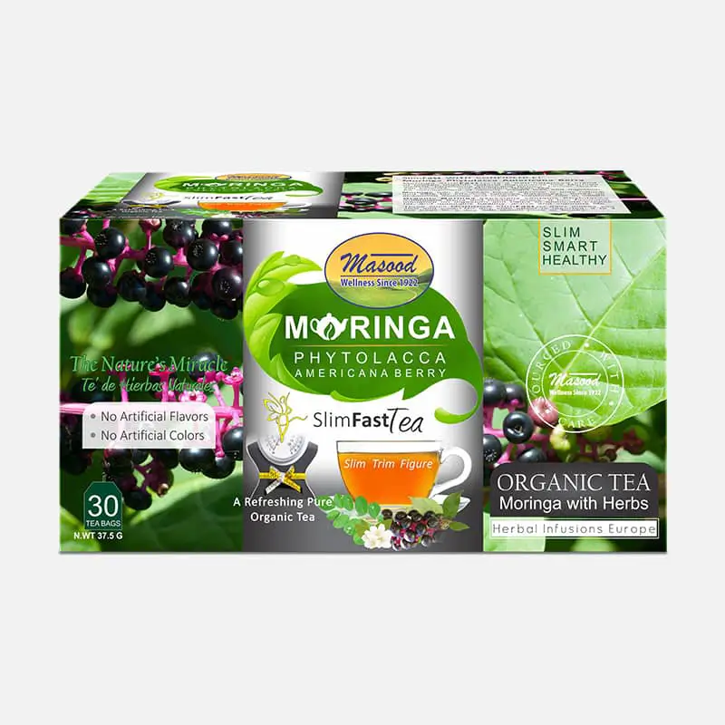 Moringa SlimFast Tea, for weight loss is a well-balanced blend of proven organic natural ingredients like Moringa oleifera, Phytolacca Americana Berries, Lemon Grass, Jati belanda, and Mountain Green Tea for management of obesity, fat burn, weight loss and digestion.